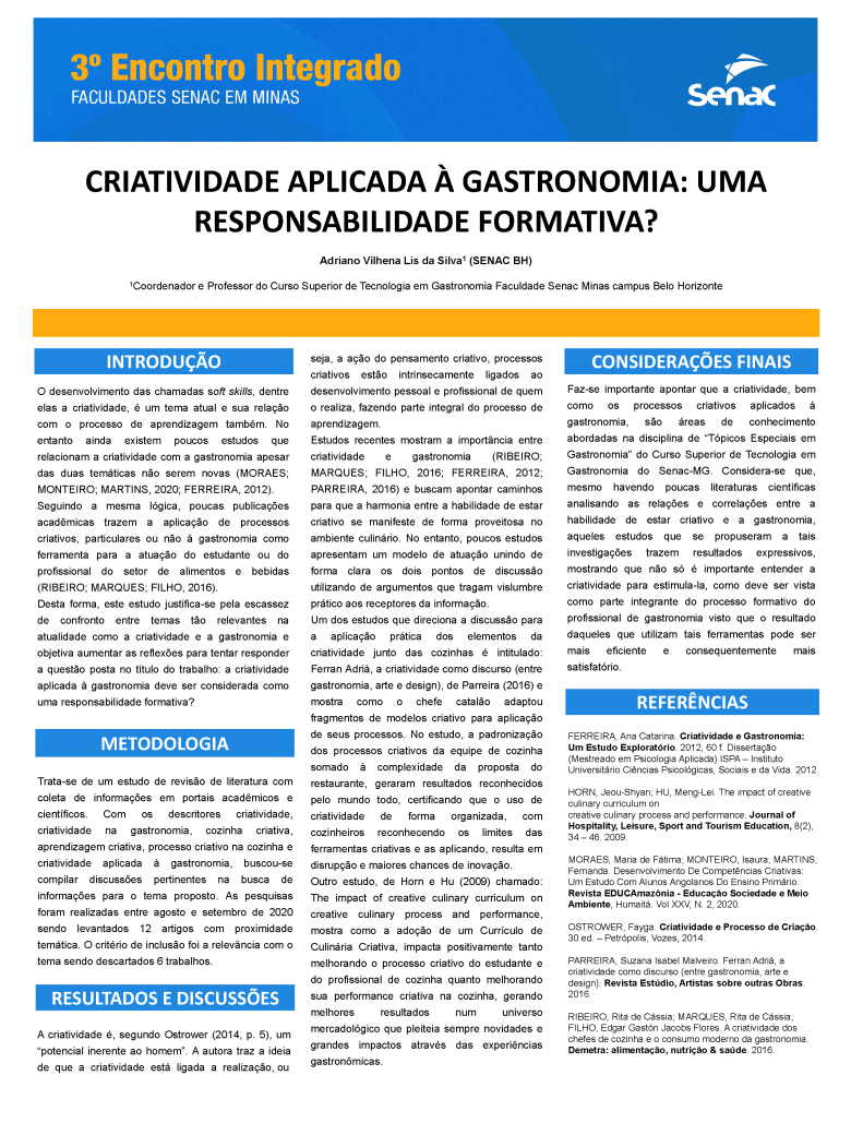 Trabalho acadêmico: 00_CRIATIVIDADE APLICADA À GASTRONOMIA UMA RESPONSABILIDADE FORMATIVA UNIDADE BELO HORIZONTE