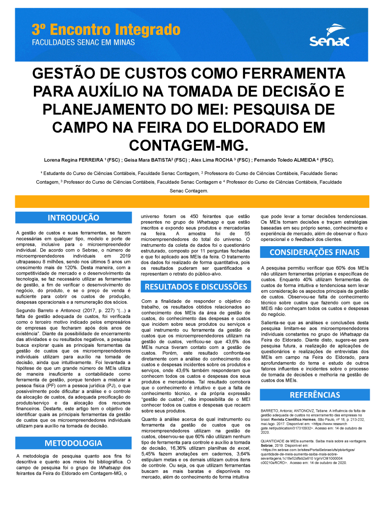 Trabalho acadêmico: 00_GESTÃO DE CUSTOS COMO FERRAMENTA PARA AUXÍLIO NA TOMADA DE DECISÃO E PLANEJAMENTO DO MEI PESQUISA DE CAMPO NA FEIRA DO ELDORADO EM CONTAGEM. UNIDADE CONTAGEM
