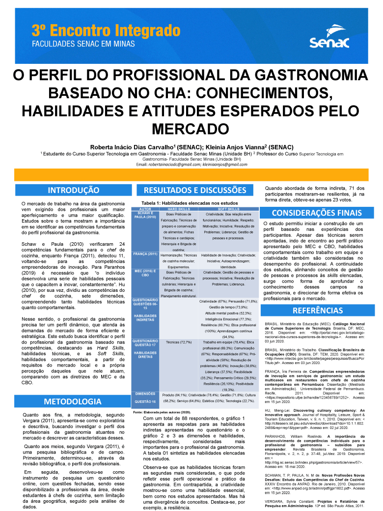 Trabalho acadêmico: 00_O PERFIL DO PROFISSIONAL DA GASTRONOMIA BASEADO NO CHA CONHECIMENTOS, HABILIDADES E ATITUDES ESPERADAS PELO MERCADO. UNIDADE BELO HORIZONTE