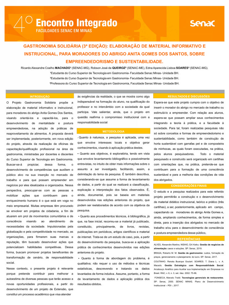 Trabalho acadêmico: GASTRONOMIA SOCIAL POSSIBILIDADE AÇÃO INCLUSÃO SOCIAL. UNIDADE BELO HORIZONTE